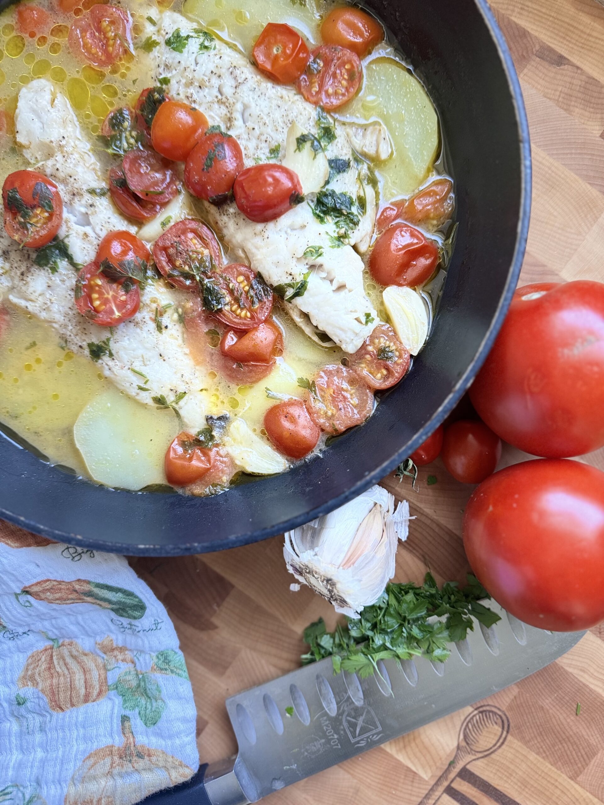 Leave it to Italians to have the funniest names for dishes! This simple yet delicious dish originated along the Amalfi coast where my family is from. My Nonno was a fisherman by trade and this dish was a staple in my family’s home using whatever the catch of the day was. This is my go to way to eat delicate fish like whiting, flounder, cod, or even filet of sole. My family’s twist on this dish is the addition of potatoes. It really makes it a complete meal!